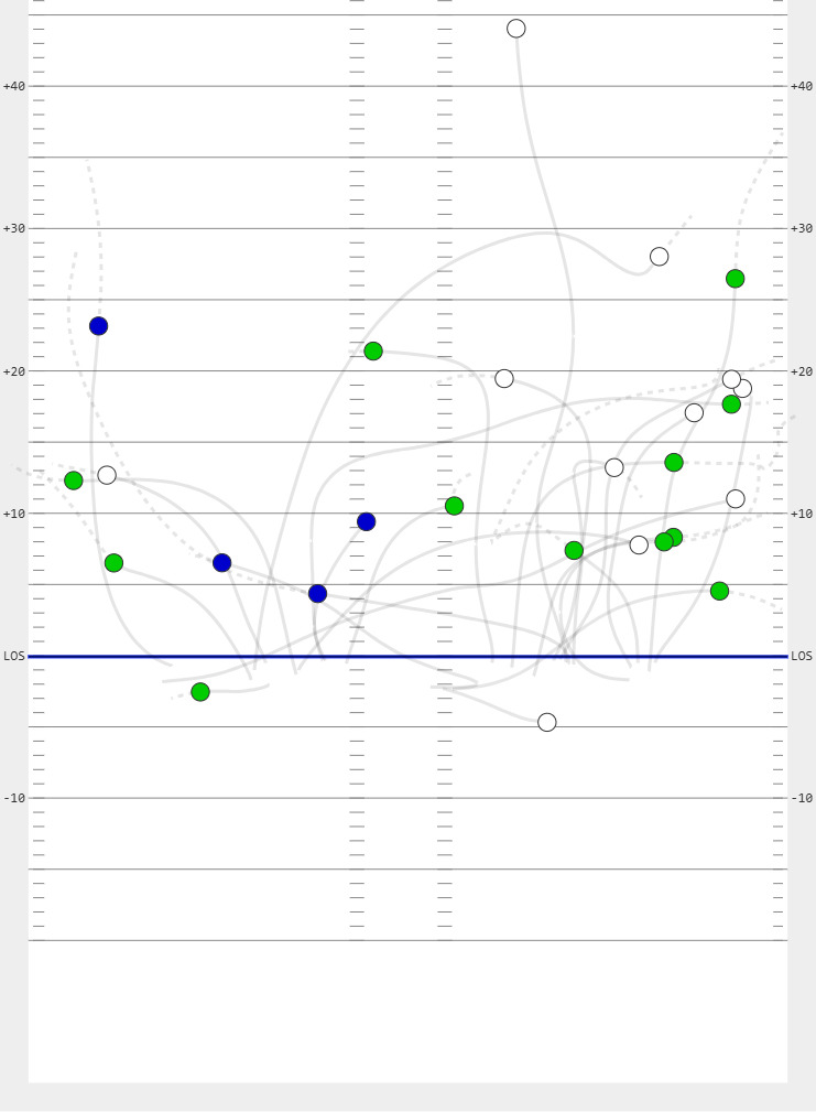 Looking at Odunze’s route chart, it’s clear to see where he truly excels. Out-breaking routes toward the sidelines make up a large portion of his catches, and he’s put ball skills on display with some very nice toe-tap grabs to stay inbounds. His catch radius is also fantastic, highlighted by a diving grab across the middle of the field in Week 3. Overall, it’s very encouraging to see targets at all three levels of the field, including a couple of deep shots as well.
