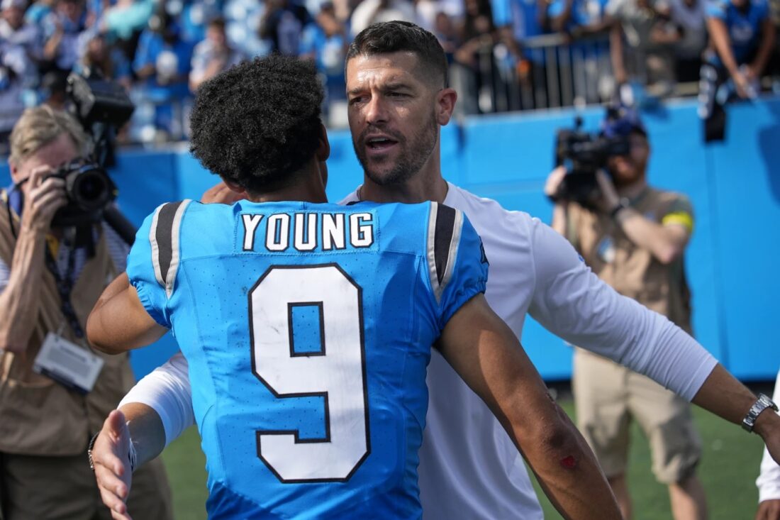 Panthers QB Bryce Young and coach Dave Canales embrace after the :Panthers routed Atlanta 30-0 this past Sunday. Carolina comes to Gillette Stadium on Sunday. (AP photo)