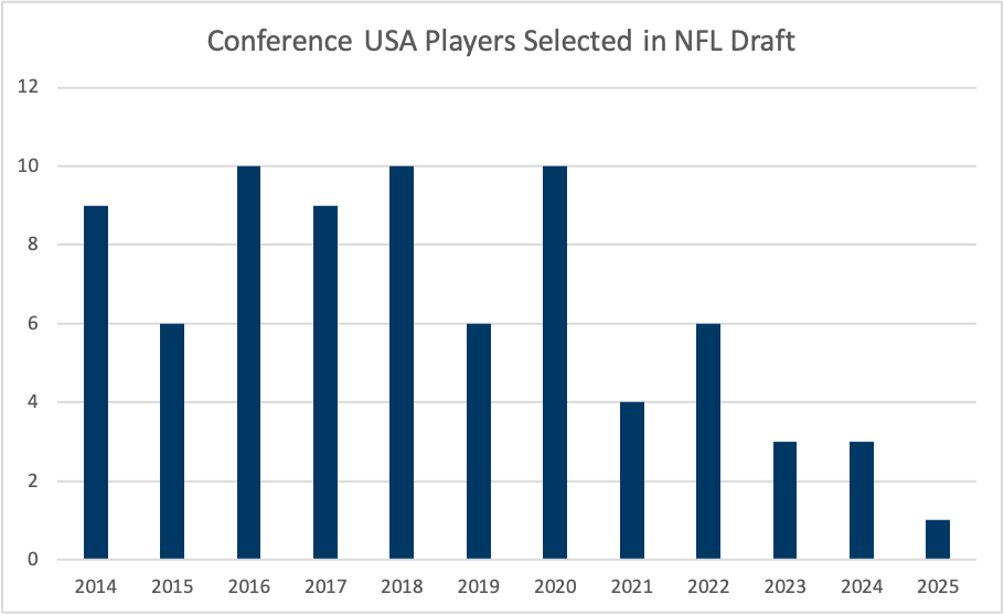 For Conference USA, the league underwent several realignment phases, notably losing six programs to the AAC between the 2023 and 2024 NFL Drafts. The general trend of drafted CUSA players is downward in the CFP era, as the league regularly saw 9 or 10 draft picks per year from 2014 through 2020, with a minimum of six over that 7-year timeframe.