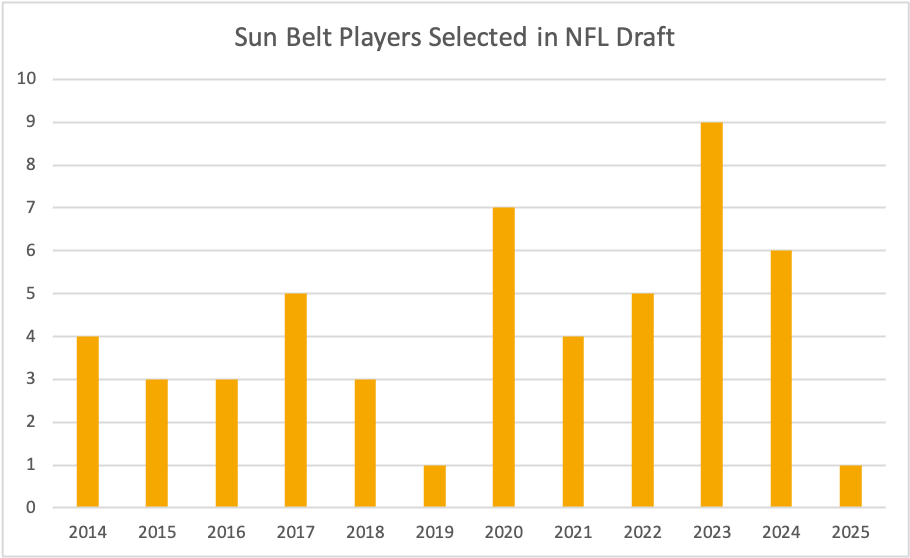 The Sun Belt hasn’t lost any teams in the CFP, except for New Mexico State which dropped to independent in 2018 and Idaho which dropped to FCS in 2018. It even poached several CUSA programs in 2022 including Marshall, Old Dominion, and Southern Miss. Prior to the 2025 NFL Draft, the general trajectory of the Sun Belt was upward when it came to draft selections. The league set a new record just two seasons ago with nine picks in 2023. Perhaps one selection 2025 is an outlier, but it could also be a sign of things to come.