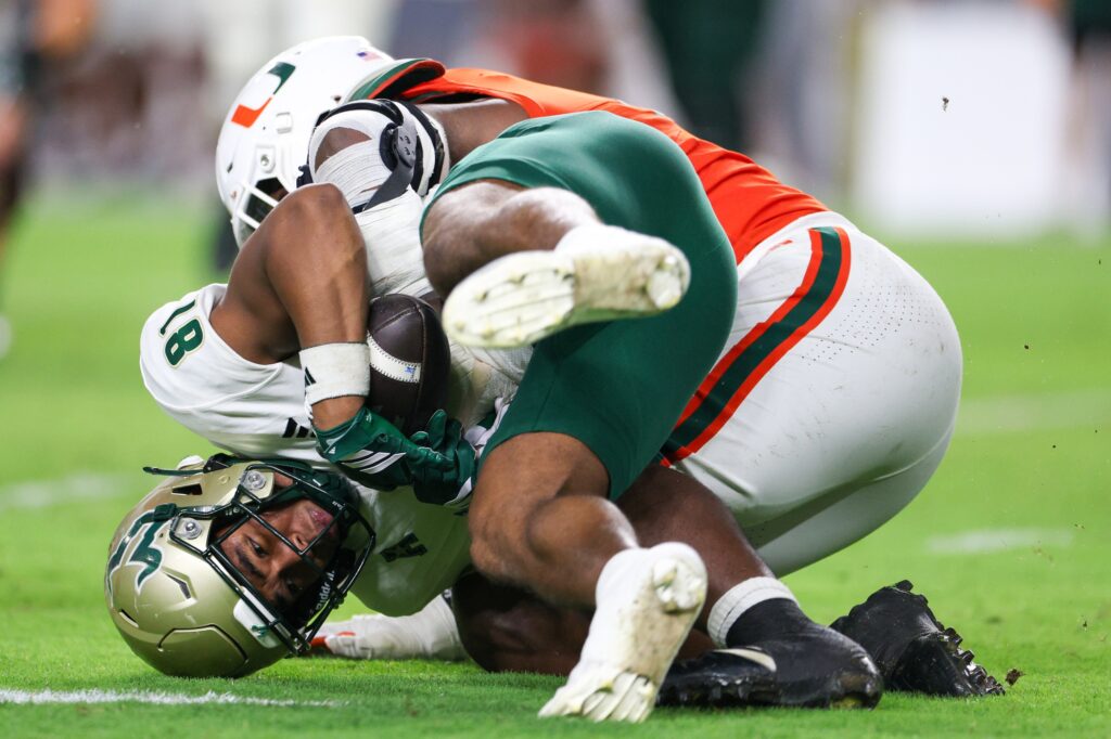 Sep 13, 2025; Miami Gardens, Florida, USA; Miami Hurricanes defensive lineman Rueben Bain Jr. (4) tackles South Florida Bulls wide receiver Christian Neptune (81) in the third quarter at Hard Rock Stadium. Mandatory Credit: Nathan Ray Seebeck-Imagn Images