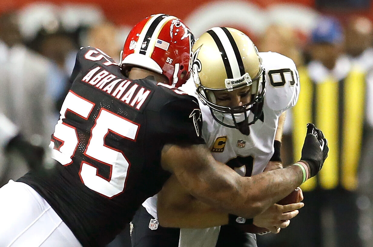 John Abraham takes down Saints quarterback Drew Brees for one of his 133.5 career sacks. (Kevin C. Cox / Getty Images)