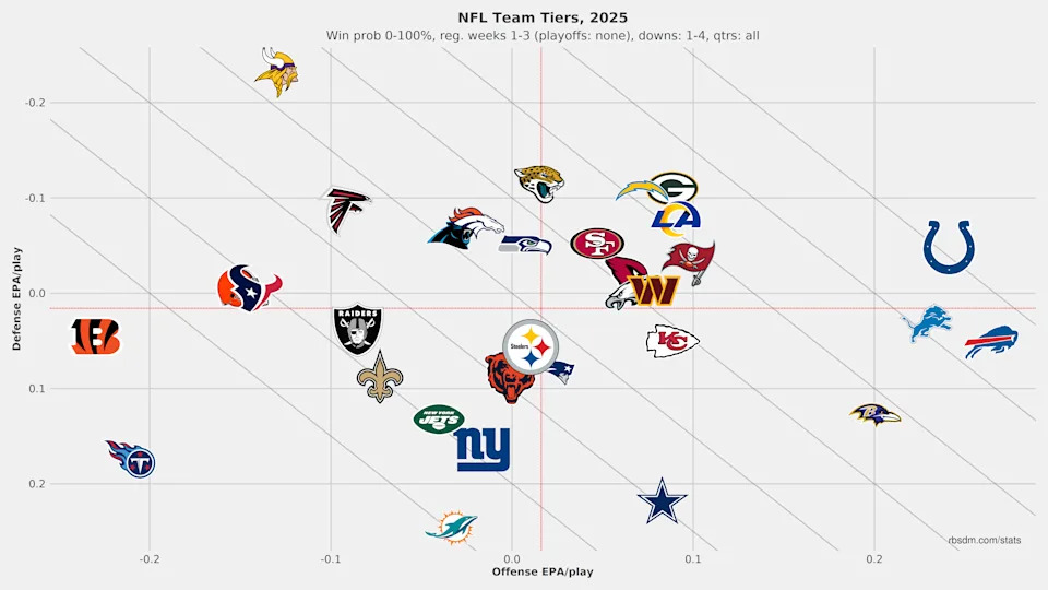 Pivoting to our EPA-based team tiers, the diagnosis is very similar. The defense is not quite as bad as the Dolphins here, but pretty darn close. Of note: out of the six teams at the bottom of the league in EPA/play allowed, only the Cowboys have won a game. The lone win came, of course, against the Giants.