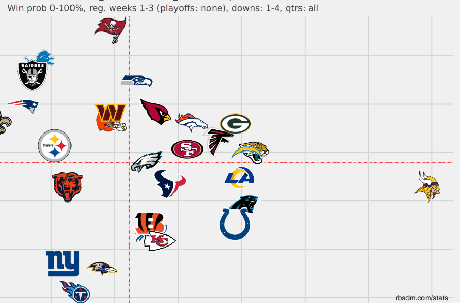 13. Minnesota Vikings: 71.69, 27.85 – And all of a sudden, the team with the terrible second year quarterback is tied for first in the NFC North. I’ve seen a few commenters online giving the Vikings guff for moving on from Sam Darnold, but maybe it doesn’t matter. Carson Wentz was perfectly efficient against Cincinnati on Sunday, Jordan Mason even more so on the ground, and, well, look where the Vikings’ defense is living on this chart.