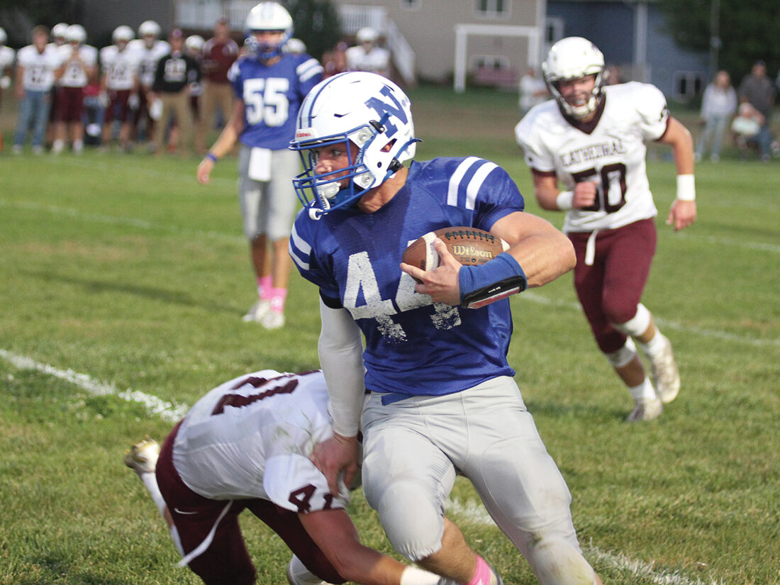 New Ulm Cathedral quarterback Eli Anderson (10) runs the ball while Nicollet’s Colton Rengstorf (13) attempts to make the tackle during a nine-man football game Friday night at Nicollet High School.
