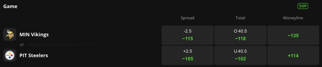The Vikings are favored by 2.5 points and hold -135 odds on the moneyline on DraftKings Sportsbook. The Steelers hold +114 odds of getting the outright victory with the game total set at 40.5.