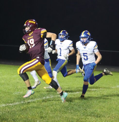 BEA’s Peter Fletcher races to the end zone for the final touchdown of the game in the Bucs’ 50-34 victory over the Hayfield Vikings. Fletcher’s 61-yard touchdown pass reception secured the win for BEA.