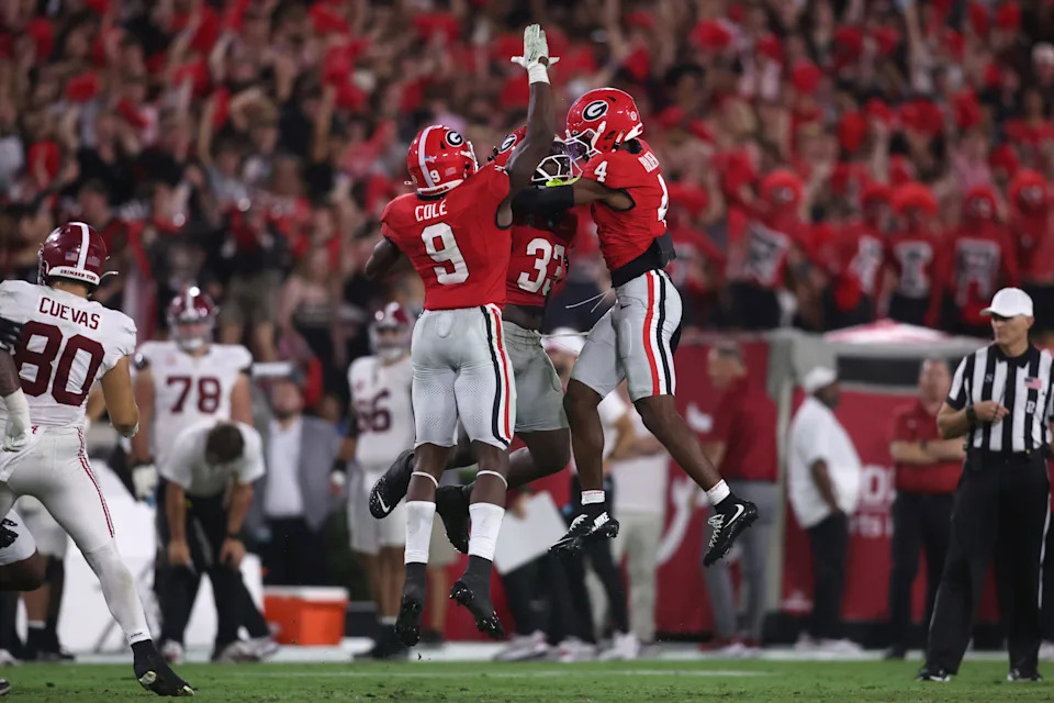 Sep 27, 2025; Athens, Georgia, USA; Georgia Bulldogs linebacker Chris Cole (9) and linebacker Quintavius Johnson (33) and defensive back KJ Bolden (4) celebrate in the third quarter against the Alabama Crimson Tide at Sanford Stadium.