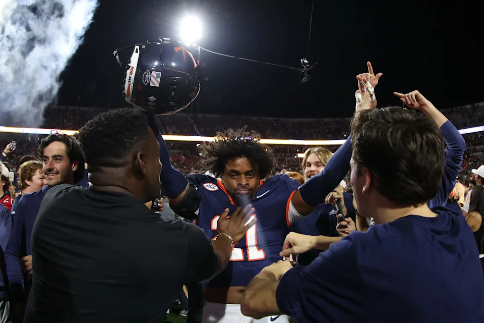 Fans rush the field and celebrate with Keke Adams #21 of the Virginia Cavaliers after a game against the Florida State Seminoles at Scott Stadium on September 26, 2025 in Charlottesville, Virginia.