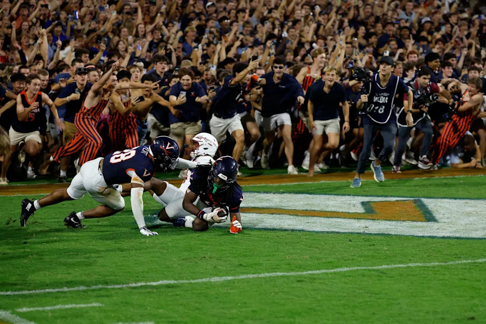 Fans of the Virginia Cavaliers rush the field to celebrate after a game against the Florida State Seminoles at Scott Stadium on September 26, 2025 in Charlottesville, Virginia.