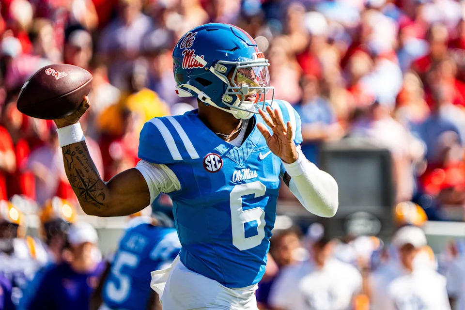 Ole Miss quarterback Trinidad Chambliss (6) passes the ball during a college football game between Ole Miss and LSU at Vaught-Hemingway Stadium in Oxford, Miss., on Saturday, Sept. 27, 2025.