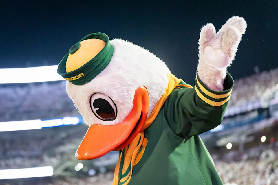 The Duck wanders the sideline as the Oregon Ducks face the Penn State Nittany Lions on Sept. 27, 2025, at Beaver Stadium in University Park, Pennsylvania.