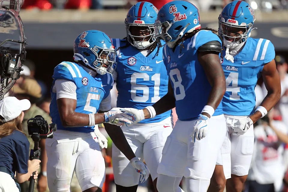 Sep 27, 2025; Oxford, Mississippi, USA; Mississippi Rebels running back Kewan Lacy (5) and tight end Dae’Quan Wright (8) react after a touchdown during the second quarter against the LSU Tigers at Vaught-Hemingway Stadium.