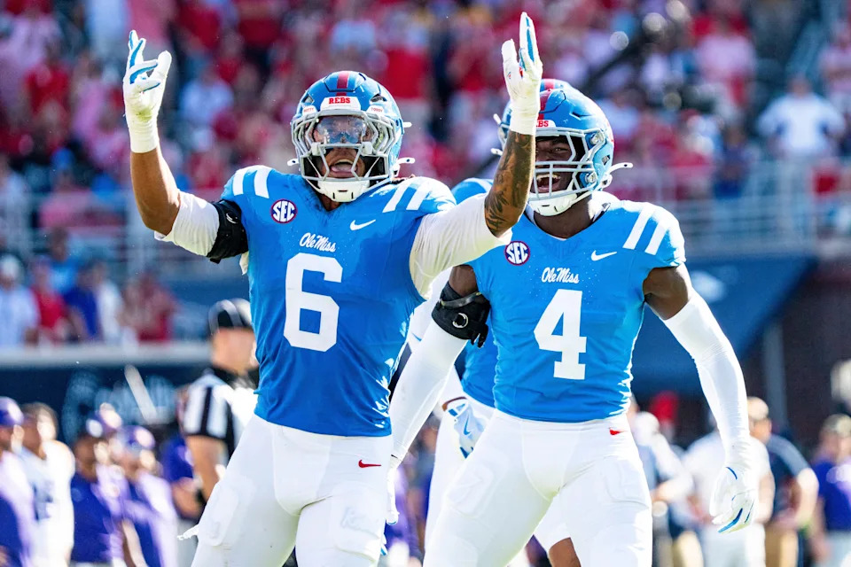 Ole Miss linebacker TJ Dottery (6) celebrates during a college football game between Ole Miss and LSU at Vaught-Hemingway Stadium in Oxford, Miss., on Saturday, Sept. 27, 2025.