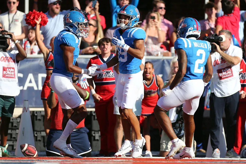 Sep 27, 2025; Oxford, Mississippi, USA; Mississippi Rebels wide receiver Cayden Lee (19) reacts with wide receiver De’Zhaun Stribling (1) and wide receiver Harrison Wallace III (2) after Lee’s touchdown during the second quarter at Vaught-Hemingway Stadium.