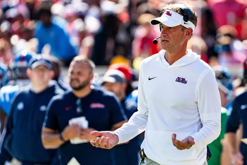 Ole Miss head coach Lane Kiffin reacts to an official during a college football game between Ole Miss and LSU at Vaught-Hemingway Stadium in Oxford, Miss., on Saturday, Sept. 27, 2025.