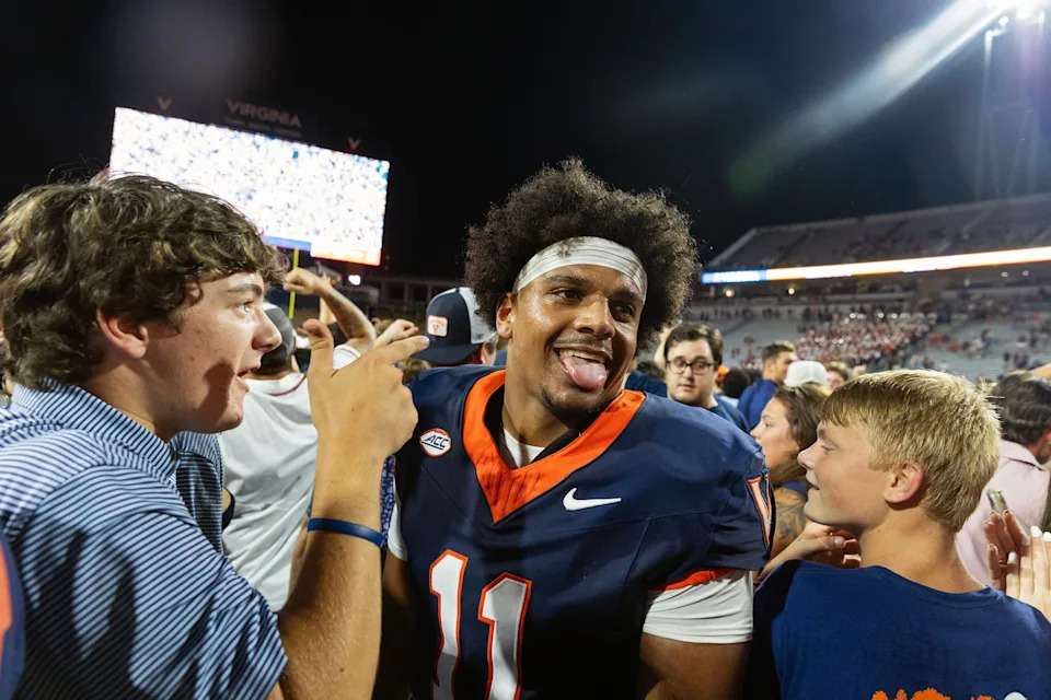 Fans rush the field and celebrate with Maddox Marcellus #11 of the Virginia Cavaliers after a game against the Florida State Seminoles at Scott Stadium on September 26, 2025 in Charlottesville, Virginia.