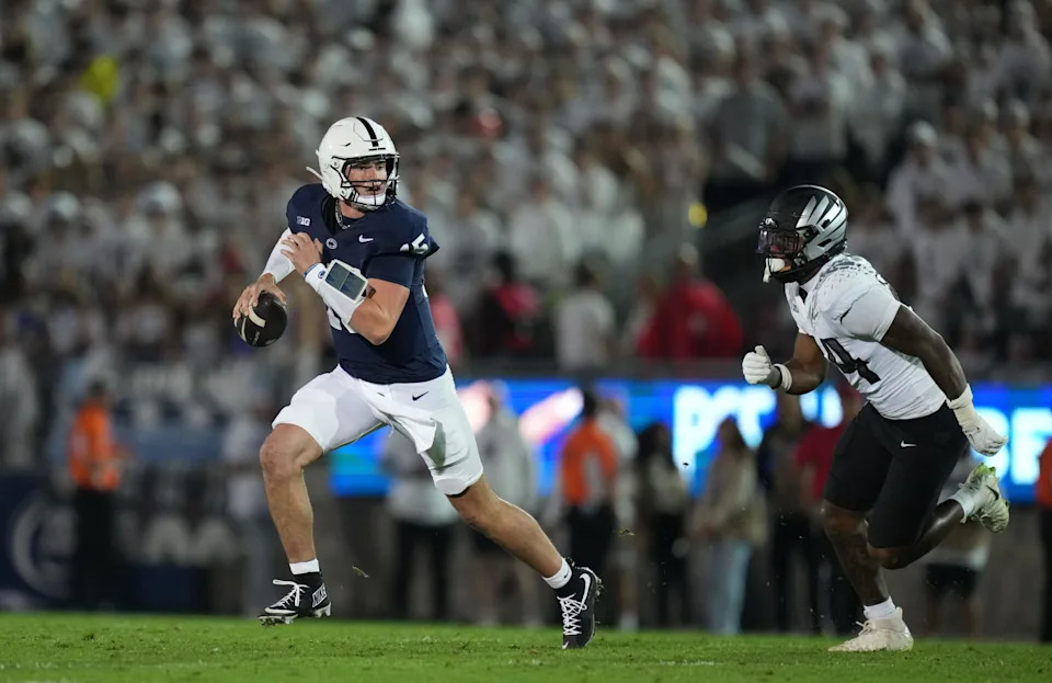 Sep 27, 2025; University Park, Pennsylvania, USA; Penn State Nittany Lions quarterback Drew Allar (15) runs out of the pocket as Oregon Ducks linebacker Jerry Mixon (54) chases during the second quarter at Beaver Stadium. Mandatory Credit: James Lang-Imagn Images