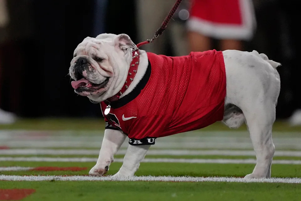 Georgia Bulldogs mascot Uga XI on the field before the start of a NCAA college football game against Alabama in Athens, Ga., on Saturday, September 27, 2025.