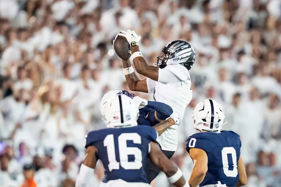 Oregon wide receiver Dakorien Moore hauls in a reception as the Oregon Ducks face the Penn State Nittany Lions on Sept. 27, 2025, at Beaver Stadium in University Park, Pennsylvania.