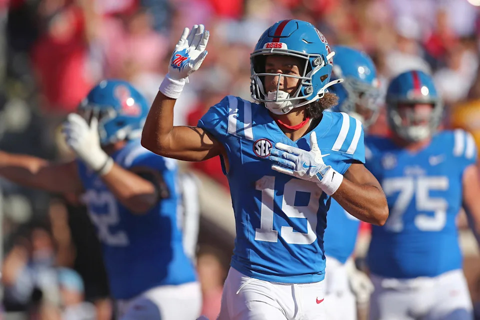 Sep 27, 2025; Oxford, Mississippi, USA; Mississippi Rebels wide receiver Cayden Lee (19) reacts after his touchdown during the second quarter at Vaught-Hemingway Stadium.