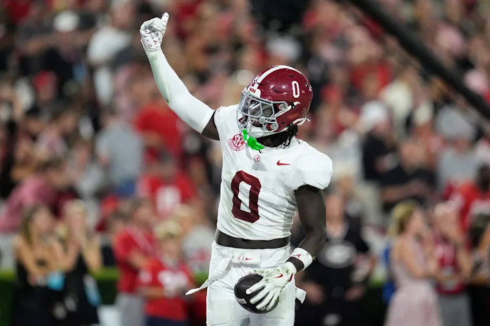 Sep 27, 2025; Athens, Georgia, USA; Alabama Crimson Tide wide receiver Germie Bernard (5) runs against Georgia Bulldogs defensive back Ellis Robinson IV (1) and defensive back KJ Bolden (4) in the second half at Sanford Stadium.