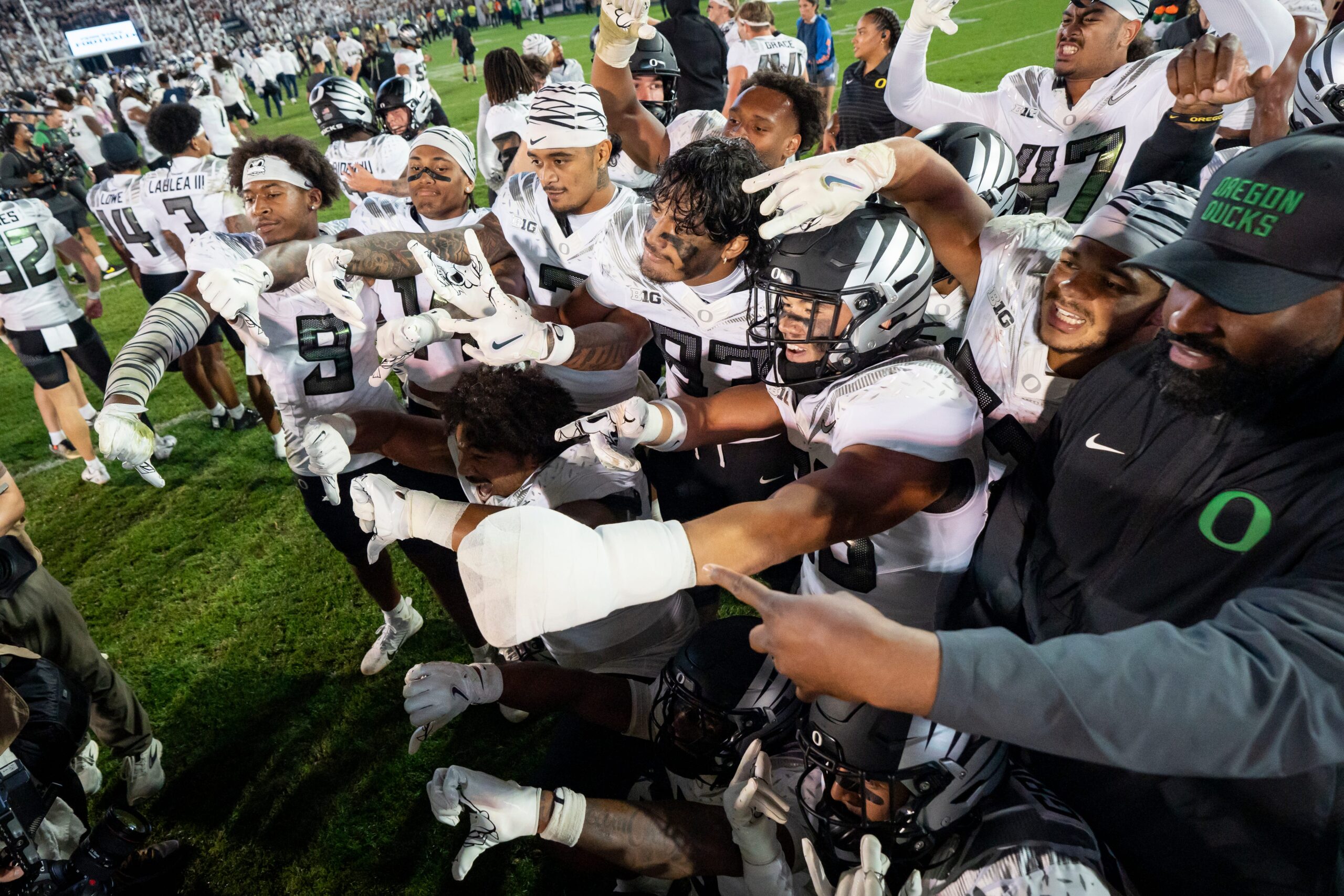 Oregon players celebrate their win as the Oregon Ducks face the Penn State Nittany Lions on Sept. 27, 2025, at Beaver Stadium in University Park, Pennsylvania.