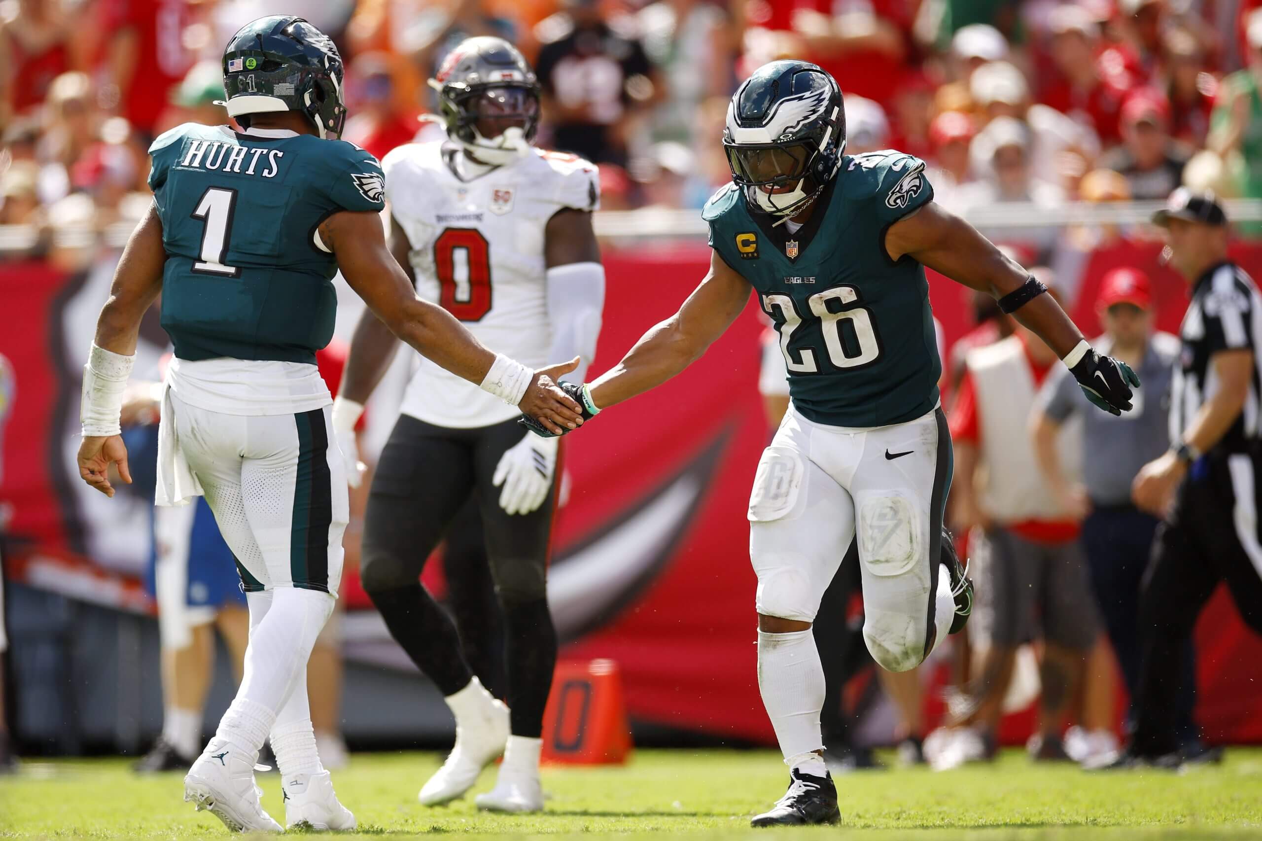 Jalen Hurts, Saquon Barkley and the Eagles stayed undefeated with a win over Tampa Bay. (Mike Ehrmann / Getty Images)