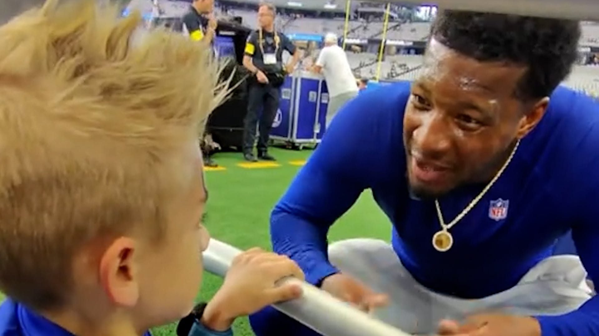 NFL Giants’ quarterback Jameis Winston made a young fan’s day by stopping for a chat and signing his jersey in a sweet video captured on the sidelines.