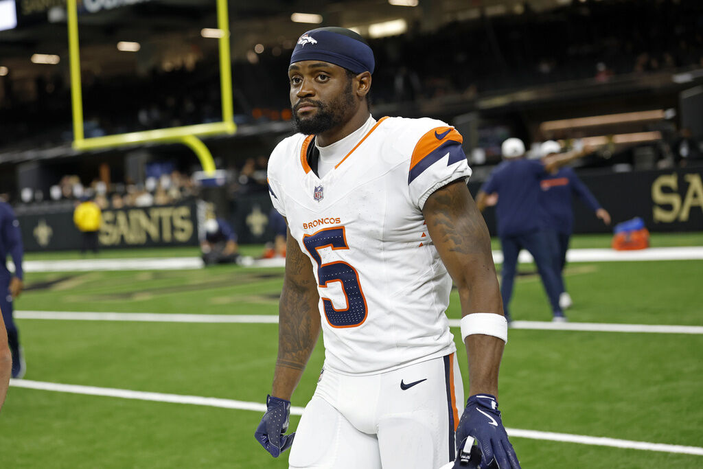 Denver Broncos wide receiver Trent Sherfield Sr. (5) warms up before an NFL preseason football game against the New Orleans Saints in New Orleans, Saturday, Aug. 23, 2024. (AP Photo/Tyler Kaufman)