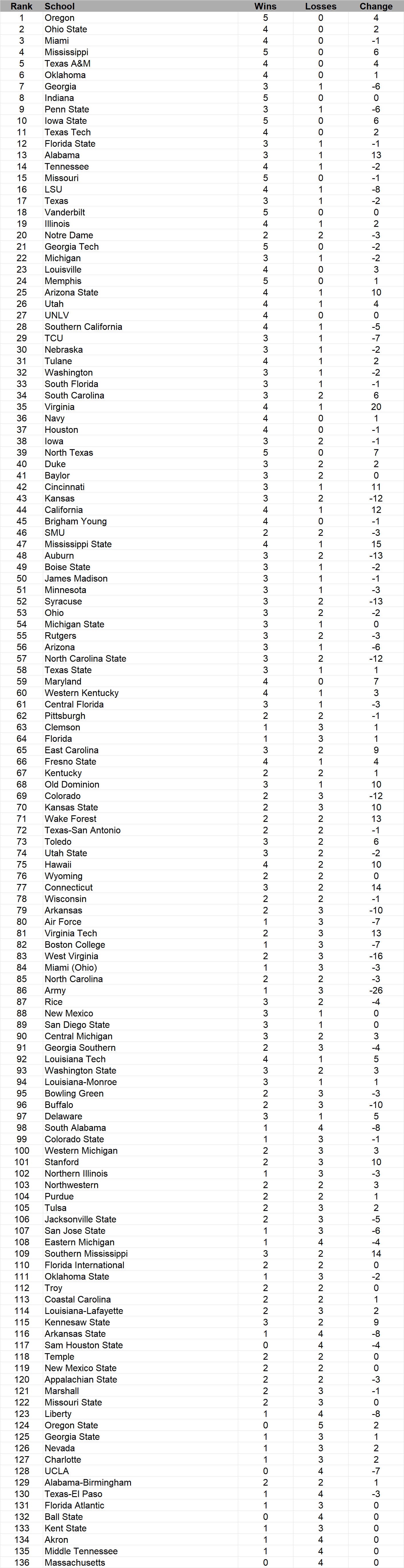 Georgia drops six spots to No. 7 after losing 24-21 to Alabama, which is up 13 spots to No. 13. The Nittany Lions are also down six to No. 9 after another loss against top-five competition. LSU suffers the biggest drop, going down eight spots to No. 16 thanks to the loss to the Rebels and the diminishing respect for the Tigers’ season-opening win against Clemson.