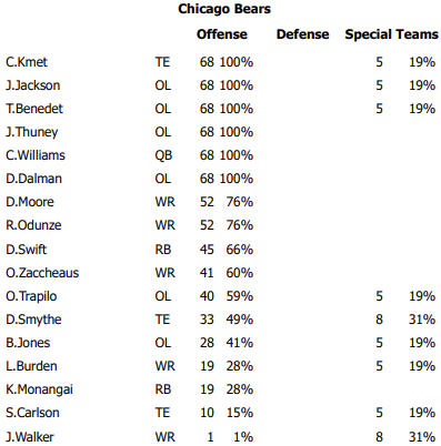 Let’s look at the Bears’ playing time breakdowns and a few individual stats from the game.