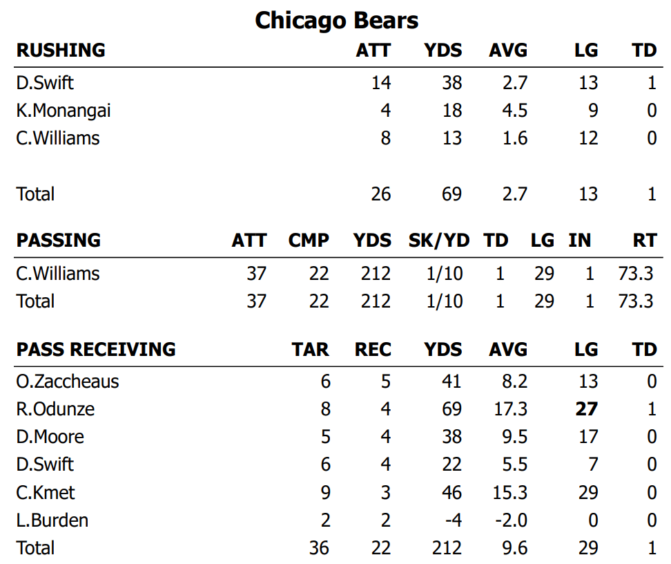 On Chicago’s final touchdown drive, Williams was 4-of-5 for 42 yards and had 2 runs for 18 yards. In the fourth quarter, he was 6-of-8 for 60 yards passing with 4 rushing attempts for 17 yards (including the victory formation kneel).