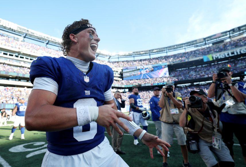 Rookie QB Jaxson Dart of the New York Giants celebrates a win against the Los Angeles Chargers after the game at MetLife Stadium in East Rutherford, New Jersey. The Giants upset the Chargers 21-18. Photo by Ishika Samant/Getty Images.