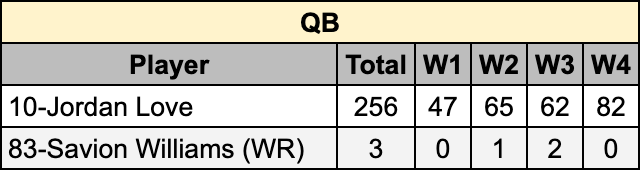 Green Bay also really leaned into playing receivers in the backfield in split-back gun looks this week, too. Coming into this game, the Packers only played seven reps like that all season. In Week 4, they added six more. Savion Williams, who now has 11 reps out of the backfield this year, is Green Bay’s primary receiver who lines up like a back.