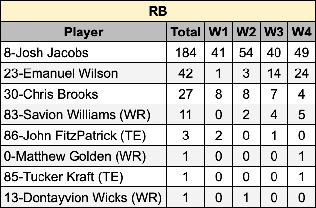 There’s pretty significant movement in the running back room. Emanuel Wilson had 20 more snaps than Chris Brooks in this game, more than Wilson’s total snaps from Week 1 through Week 3. The Packers will eventually have to drop one of Wilson or Brooks for MarShawn Lloyd to return to the active roster. Green Bay’s special teams personnel is already less than a loaded deck, and Brooks is one of the team’s key contributors in the kicking game. Meanwhile, Wilson doesn’t contribute at all to teams. It’ll be interesting to see which direction the Packers go.