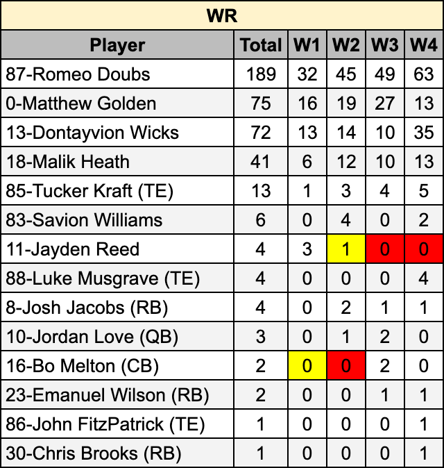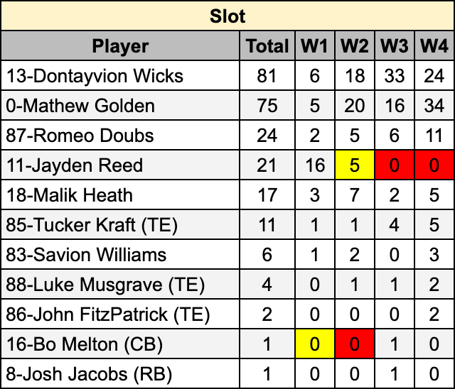 The other movement we’re seeing at the position is the team flipping Matthew Golden back to being a primary slot receiver. This happened in Week 2, when Reed dropped out with an injury, but Dontayvion Wicks played that role more than Golden in Week 3. Golden outsnapped Wicks 27-10 at outside receiver in Week 3, but was outsnapped 13-35 this week. I’m not sure if we have clarity for where the Packers want to play these guys long-term, but it is worth noting that Christian Watson, who has mostly played outside receiver, is eligible to return off the physically unable to perform list beginning with Green Bay’s next game against the Cincinnati Bengals in Week 6.