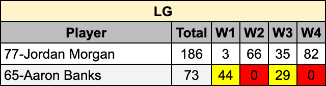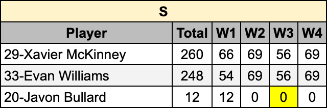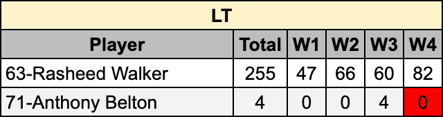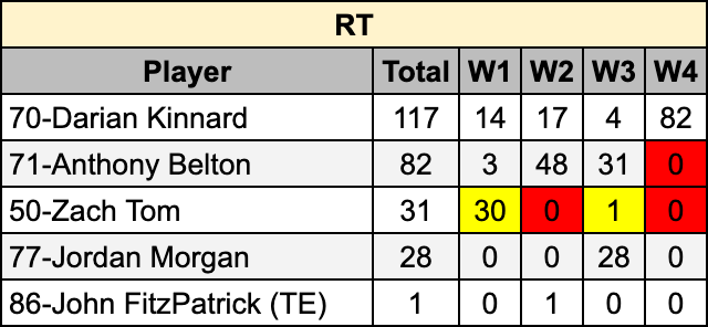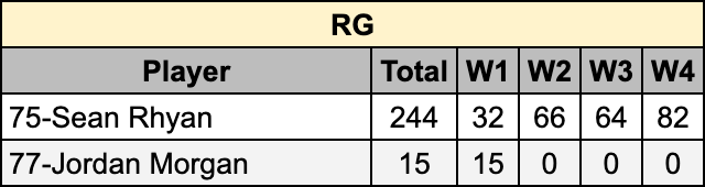 As always, the numbers in cells correlate to the number of snaps played in each week. Cells highlighted in yellow mean that a player dropped out of the game due to injury. Cells highlighted in red mean that a player missed the game due to injury.