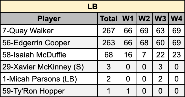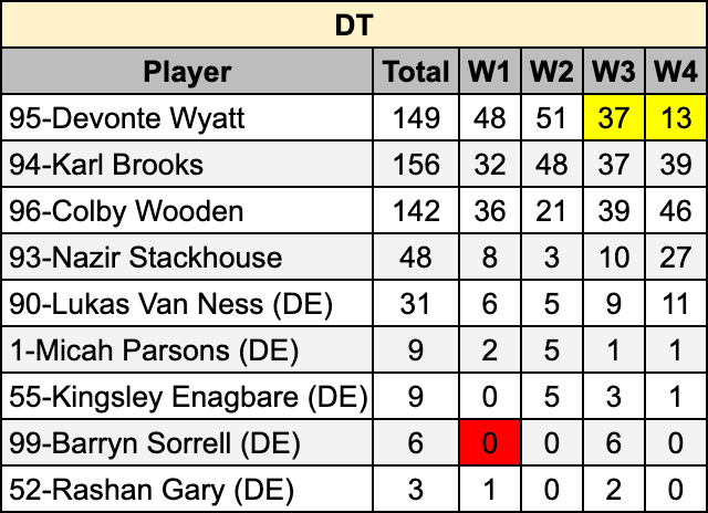Devonte Wyatt has dropped out of back-to-back games due to knee injuries, but it happened late in Week 3 and didn’t impact the loss to the Cleveland Browns, unless you want to make an argument for the kick block unit. Against the Cowboys, though, Wyatt only played 13 plays, which led to a massive increase in undrafted rookie defensive tackle Nazir Stackhouse’s playing time.