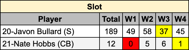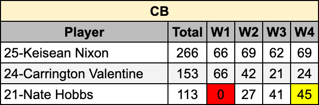 On the surface, the split between Carrington Valentine and Nate Hobbs looks pretty similar to what it was in Week 3, but that simply is not the case. Hobbs played the first 46 plays of defense, including one snap in the slot. The other 45 looks were at outside cornerback opposite of Keisean Nixon.