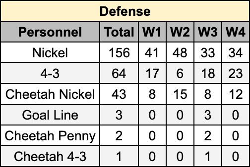 The Packers’ Cheetah package plays came in clusters, four of which were played when Dallas was in two-minute mode at the end of the second half. Besides the two-minute drill, Green Bay only played its Cheetah sets on 14 percent of their defensive plays, compared to 20 percent in Week 1 through Week 3.