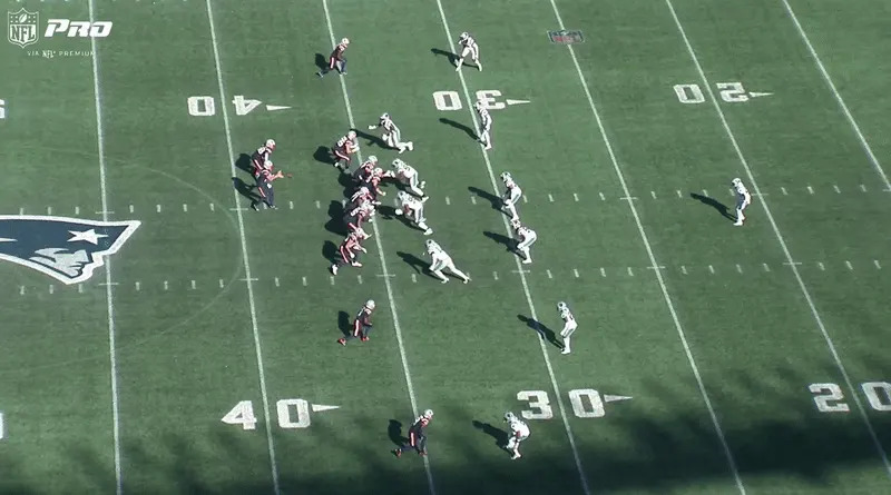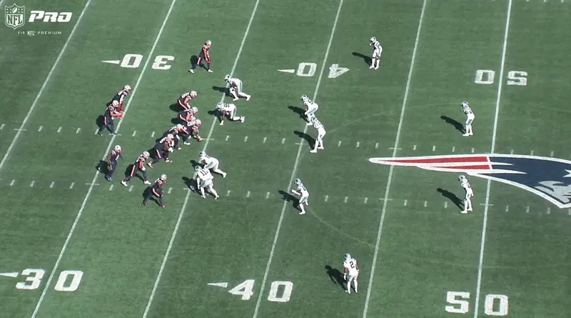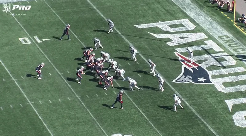 McDaniels continued with a similar action later in the game again moving Maye to his non-arm side — a change from the bootlegs in recent weeks — while the continued uptick of pre-snap motion (DeMario Douglas) helps confuse Carolina’s secondary with Hunter Henry then running underneath.