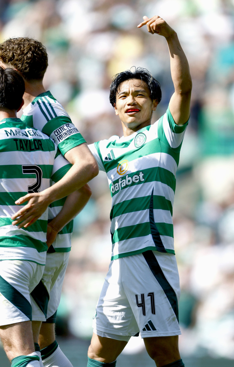 Celtic’s Reo Hatate celebrates after scoring a goal during the second half of a Scottish Premiership match against Hibernian at Celtic Park in Glasgow, Scotland, on March 10, 2025. (Kyodo) ==Kyodo