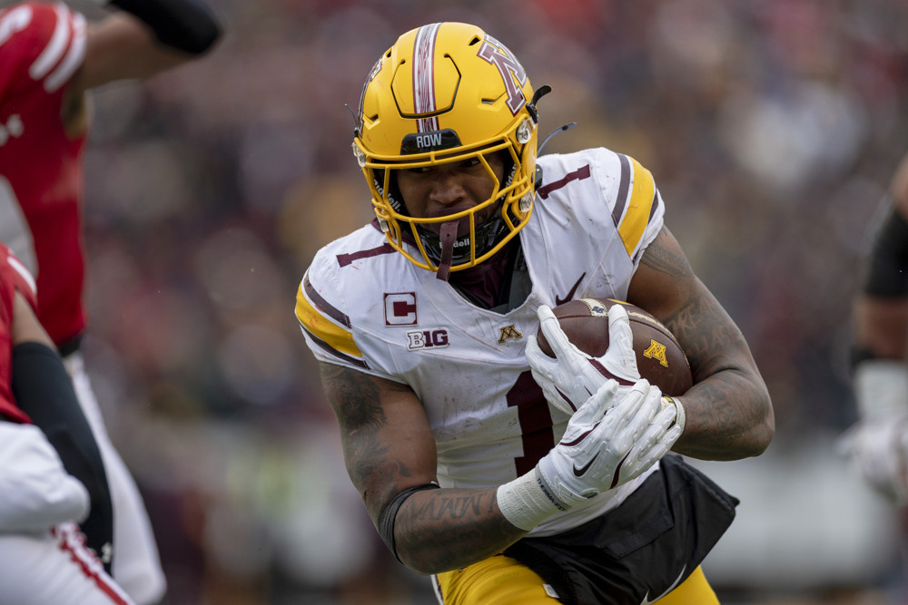 Darius Taylor is seen by a few as the RB1 due to his gaudy stats as the backbone of Minnesota’s offense. He moves well in tight spaces, has good size, and vision to navigate rushing lanes. However, I do worry about his overall athleticism and how well his skills translate to stiffer competition.