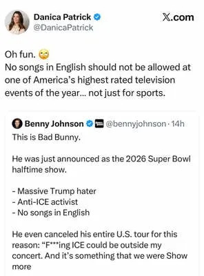 Former racecar driver Danica Patrick was among the Bad Bunny critics, writing, “Oh fun. No songs in English should not be allowed at one of America’s highest rated television events of the year… not just for sports.”