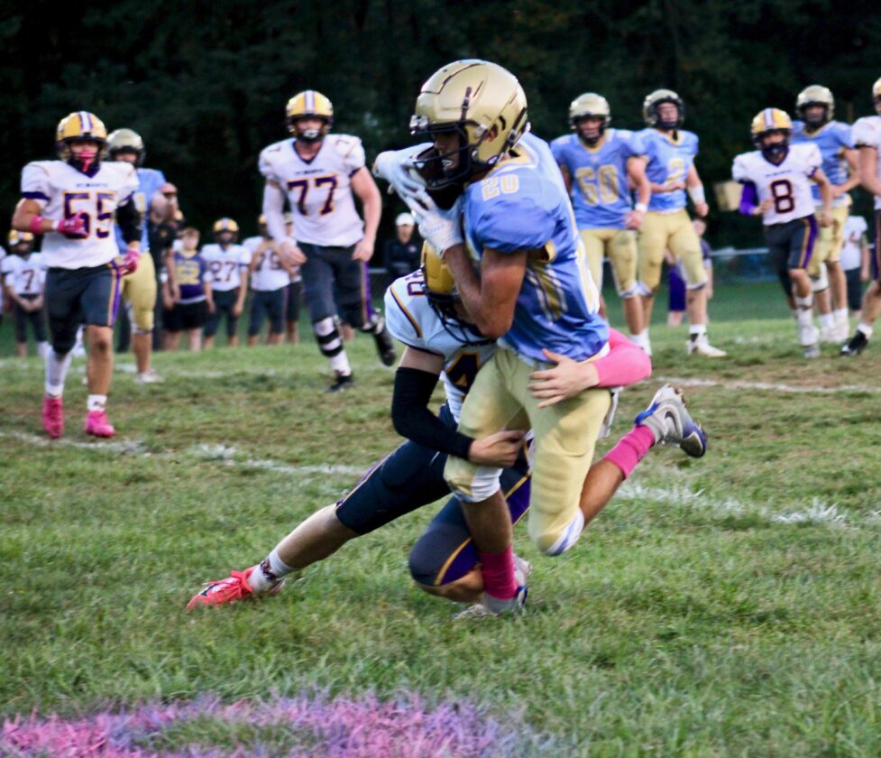 St. Marys’ Ethan Pierce (40) wraps up Frontier’s Austyn Kephart (20) during last week’s game in New Matamoras. (Photo by Kerry Patrick)