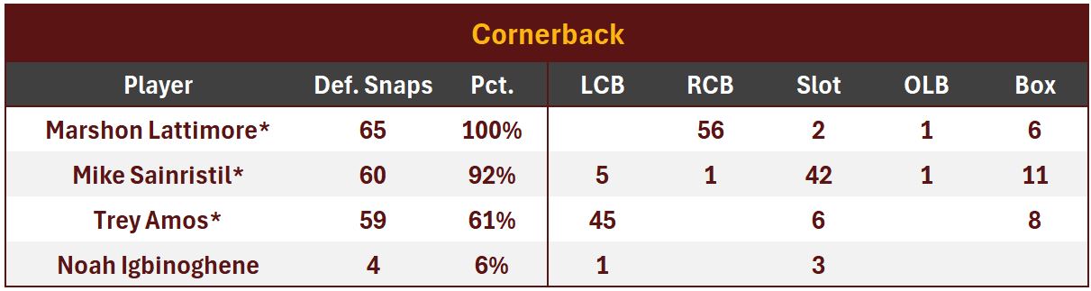 Rookie LCB Trey Amos might have fallen behind Mike Sainristil in coverage efficiency, depending on which stats service you believe. If so, it was the first game this season when he wasn’t the Commanders’ best lockdown corner. PFF counted 3 tgt and 2 rec for 40 yds, which put him at 1.4 Y/Cov Snap, just a little high for a starting boundary CB. PFR saw 4 tgt and 3 rec for 46 yds (1.6 Y/Cov Snap).