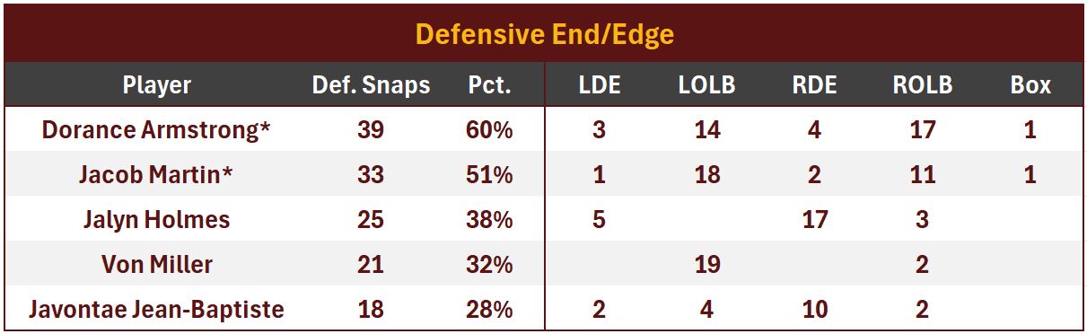 Dorance Armstrong split time roughly equally on both sides of the line, with slightly more snaps on the right side. This has been a change from last season, when he played mainly on the left edge.