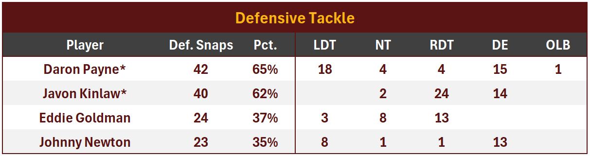 Daron Payne’s run of pressuring the QB came to an end in Atlanta, with 0 pressures on 19 pass rush snaps, his lowest number of attempts this season.
