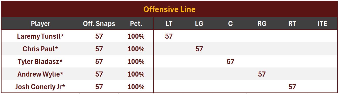 For the first time this season, all five starting linemen took 100% of offensive snaps at their designated positions. The OL was very good in pass protection, like last week. Run blocking remains a work in progress.